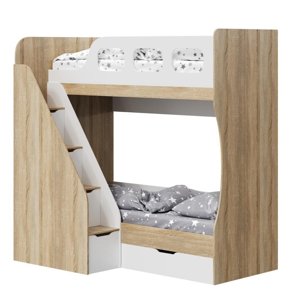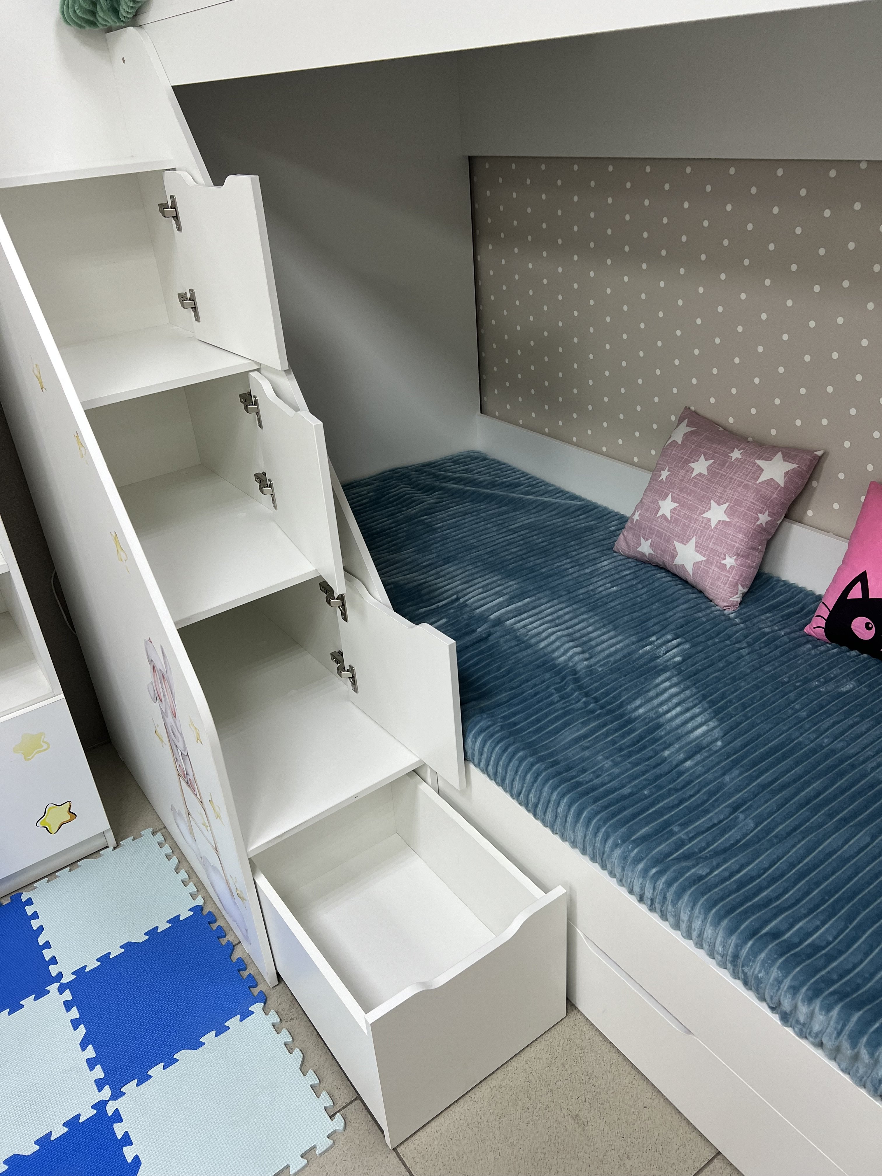 Преимущества данной модели - отлично подходит для небольших помещений, имеет удобную, безопасную лестницу с ящиками для игрушек.