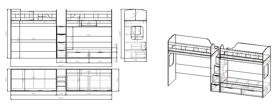 Габариты кровати: ширина 4337, высота 2098, глубина 958 мм