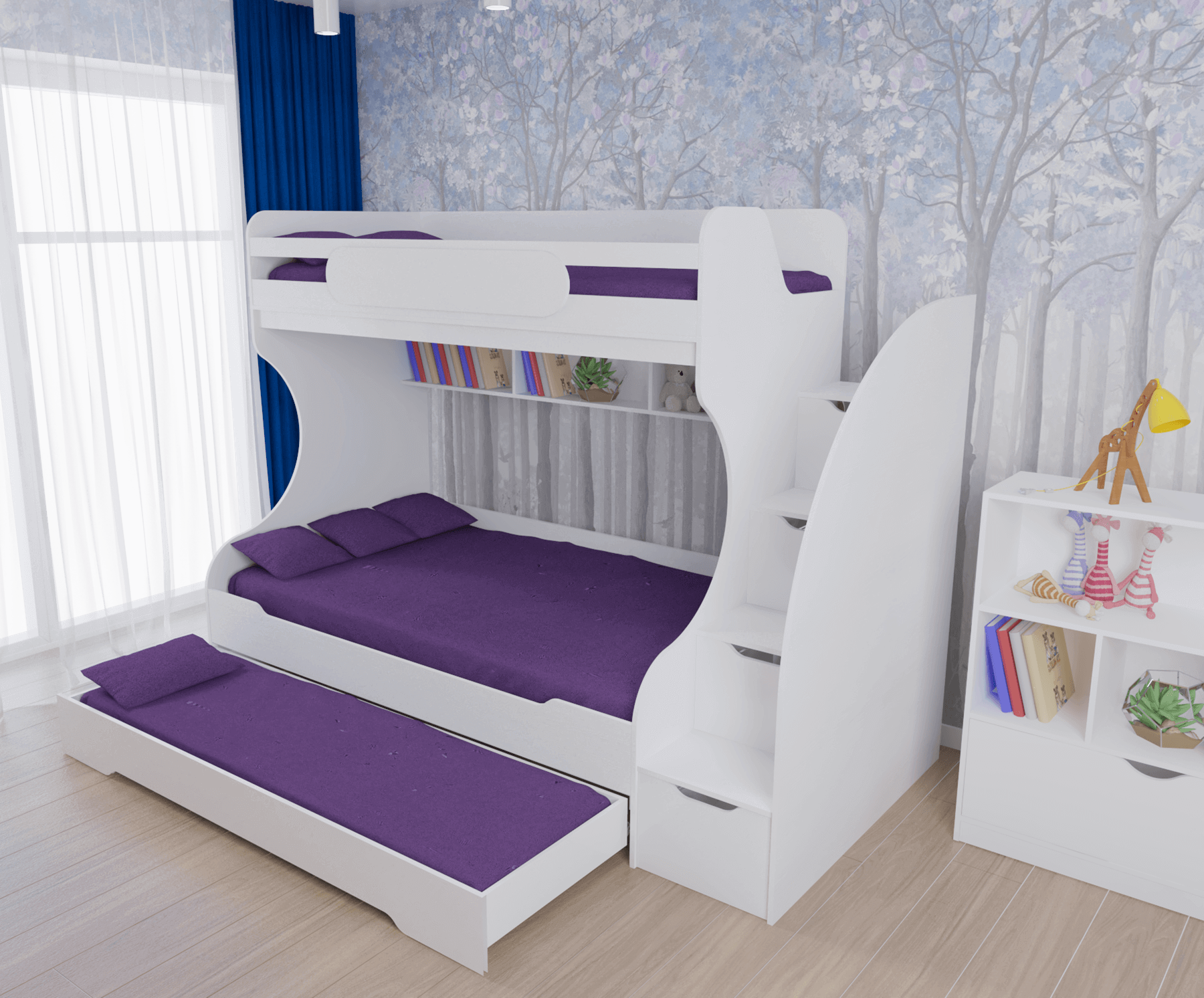 * В лестницу встроены выдвижные ящики для игрушек.