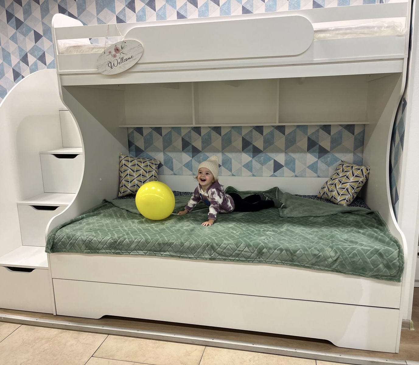 Увеличенное, просторное нижнее спальное место позволяет комфортно разместиться ребенку вместе со взрослым.