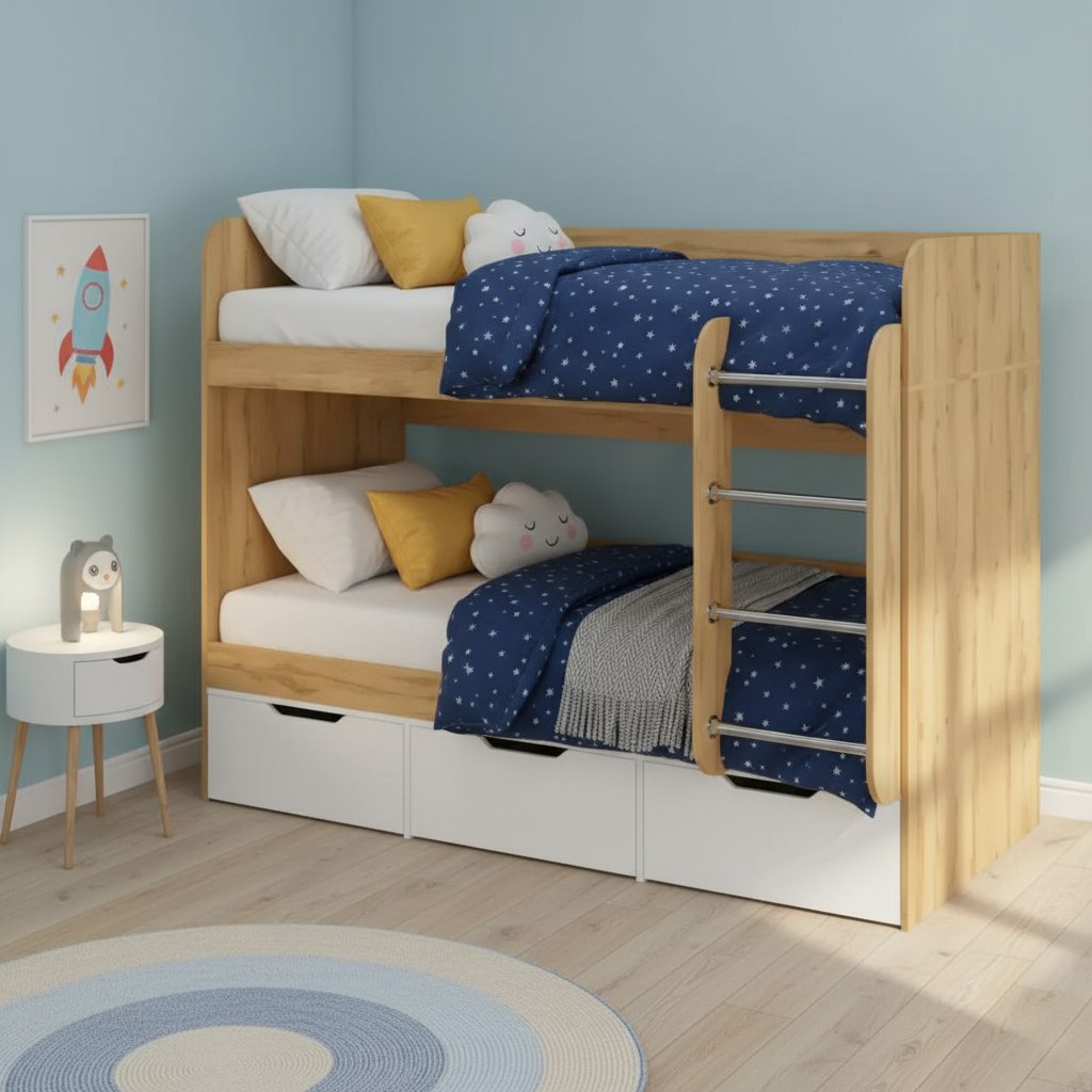 Компактная двухъярусная кровать Малыши Двойняшки создана специально для небольших помещений.
