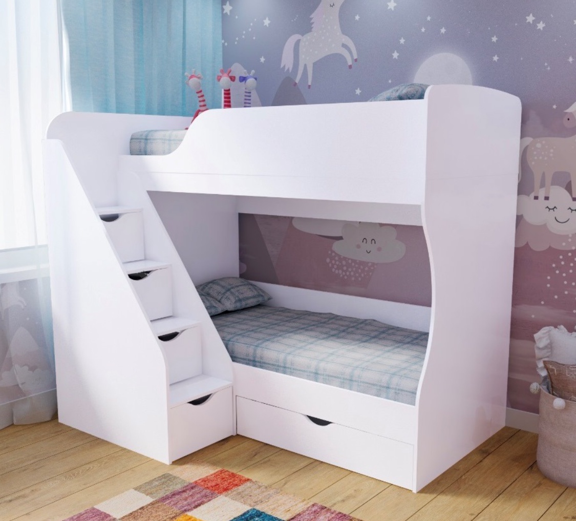 Преимущества данной модели - удобная, безопасная лестница с ящиками для игрушек и комфортная высота кровати.
