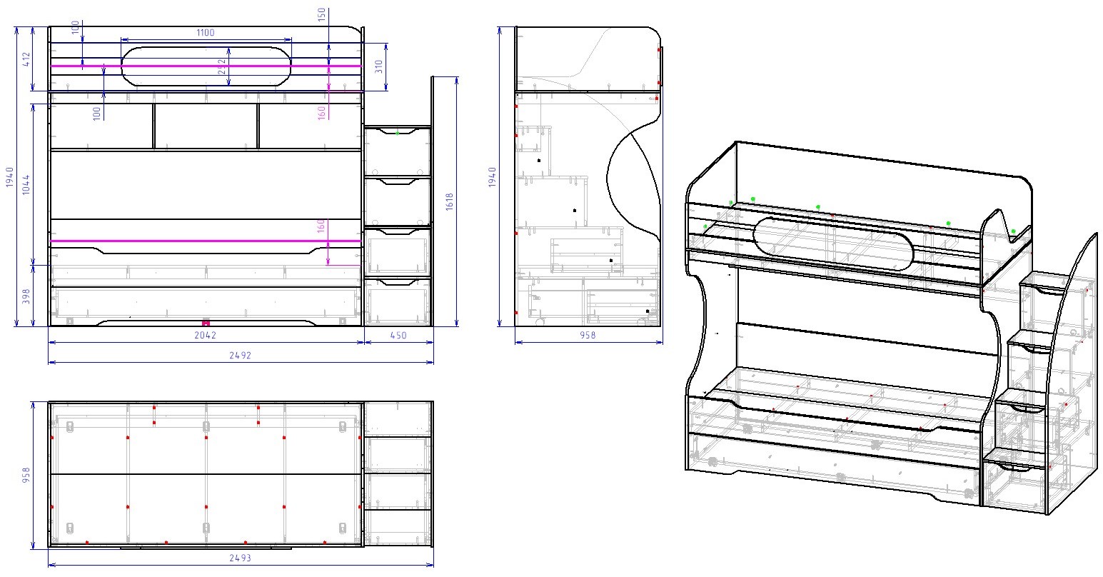 Габариты кровати: ширина 2493, глубина 958, высота 1940 мм