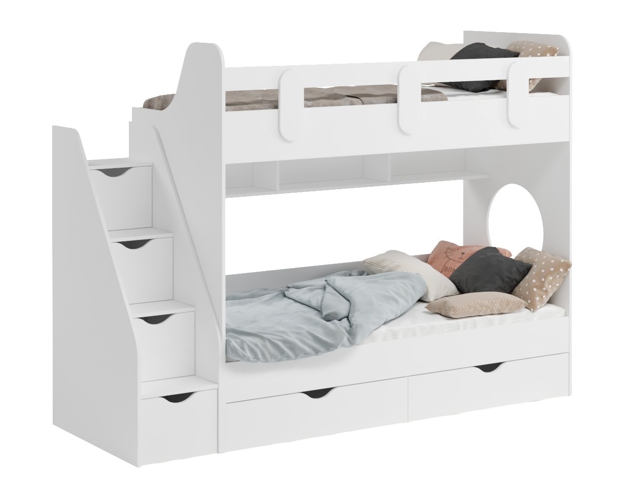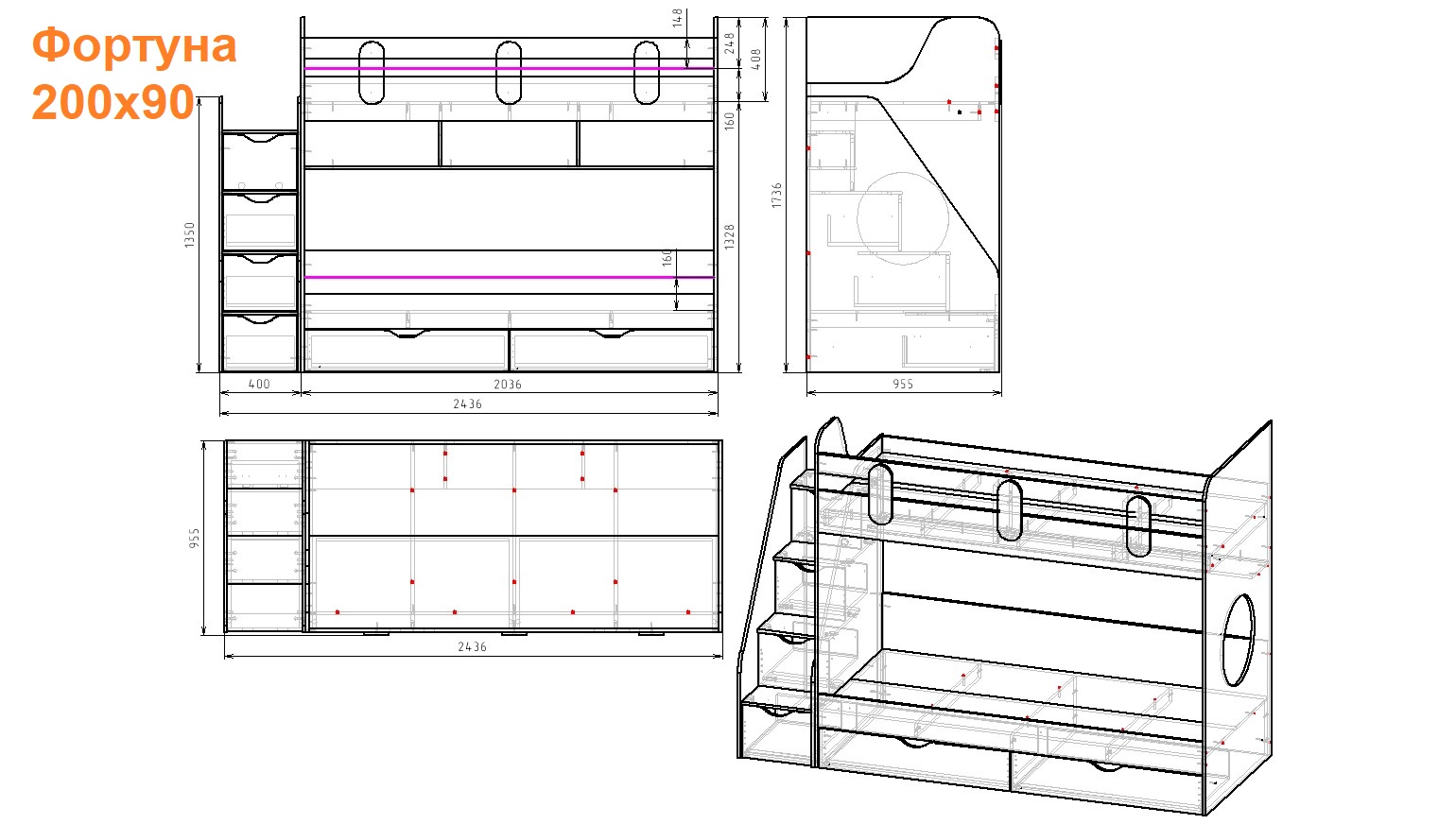 Габариты кровати с учетом лестницы: ширина 2436 х высота 1736 х глубина 955 мм