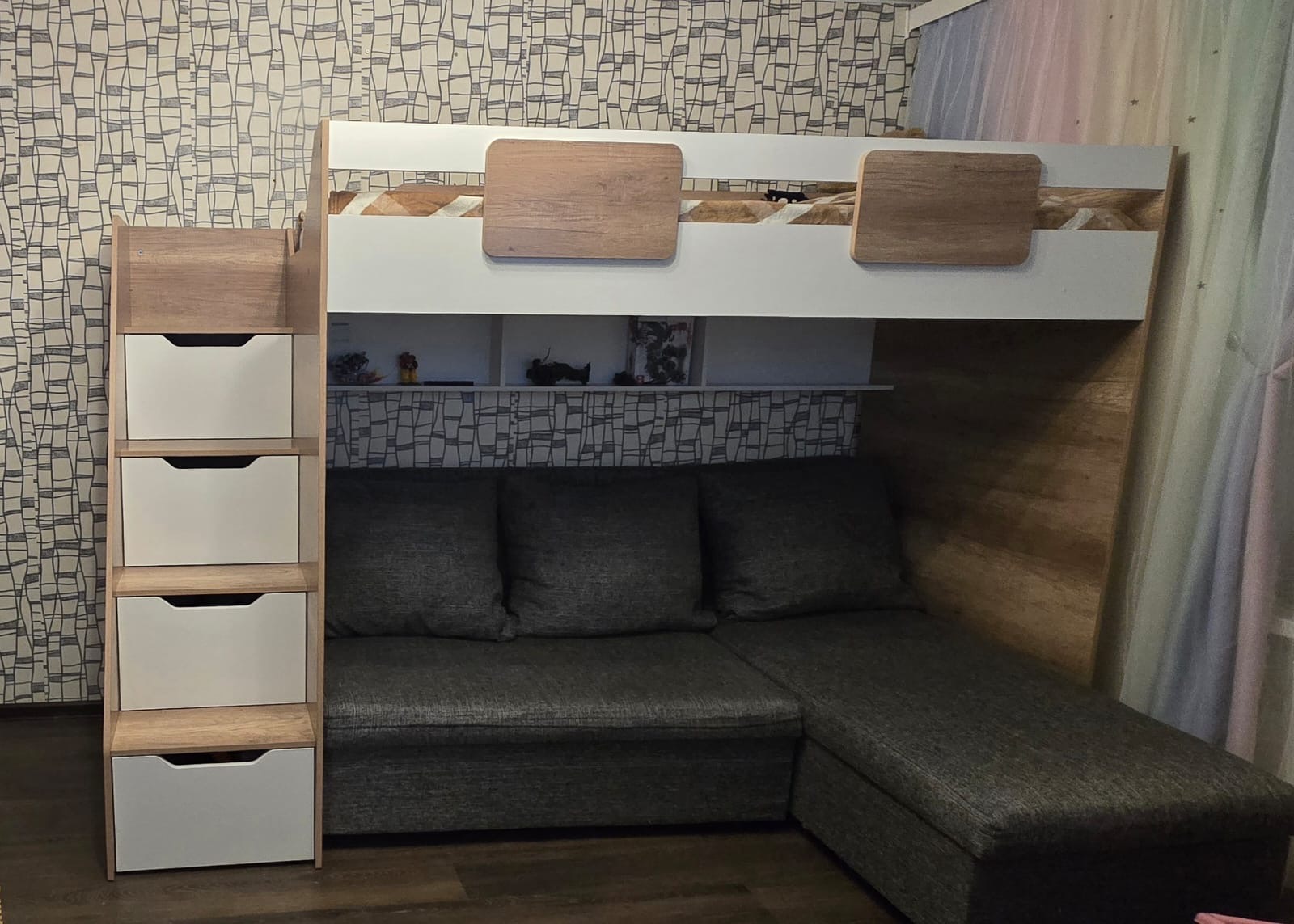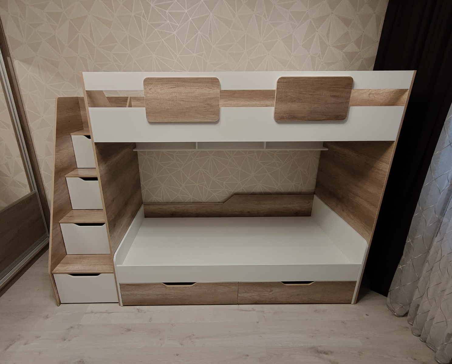 Вместо них - цельный и прочный настил из ЛДСП, который выдерживает сверхвысокую нагрузку и позволяет расположиться даже взрослому с ребенком.