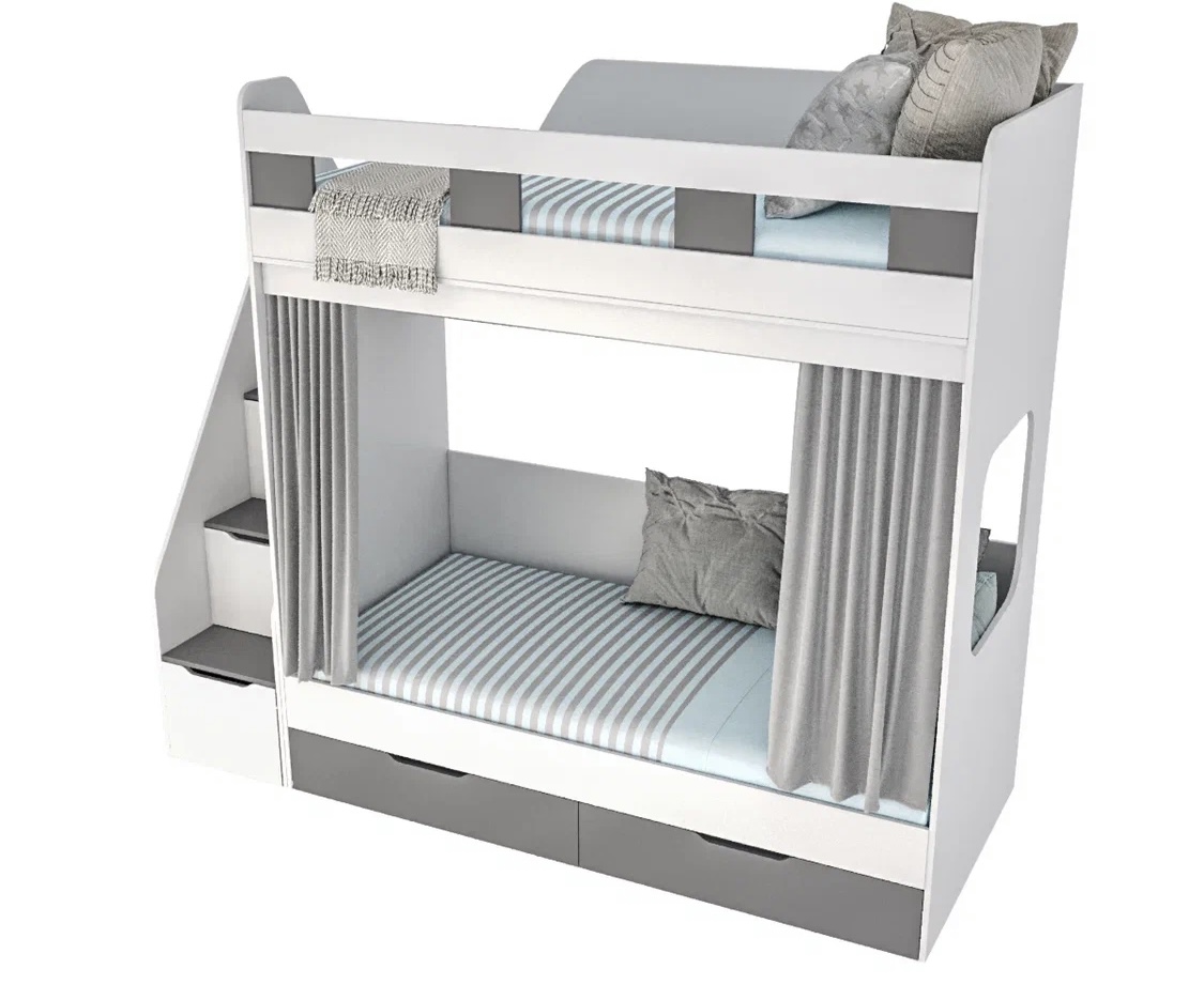 Прочная, стильная двухъярусная кровать Твинс с удобной лестницей, безопасным высоким бортиком и ящиками для хранения.
