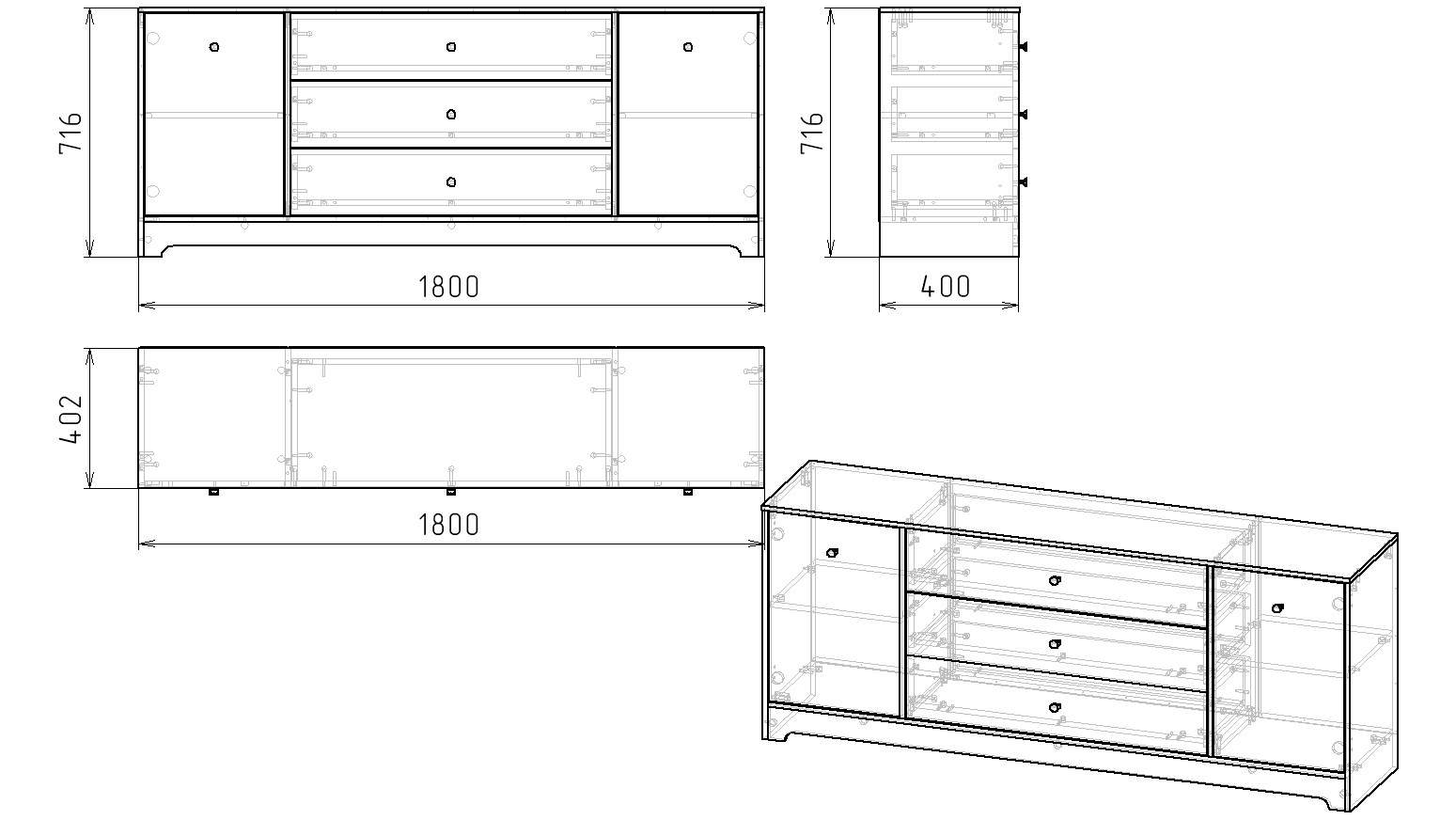 Габариты тумбы: ширина 1800, глубина 402, высота 716 мм