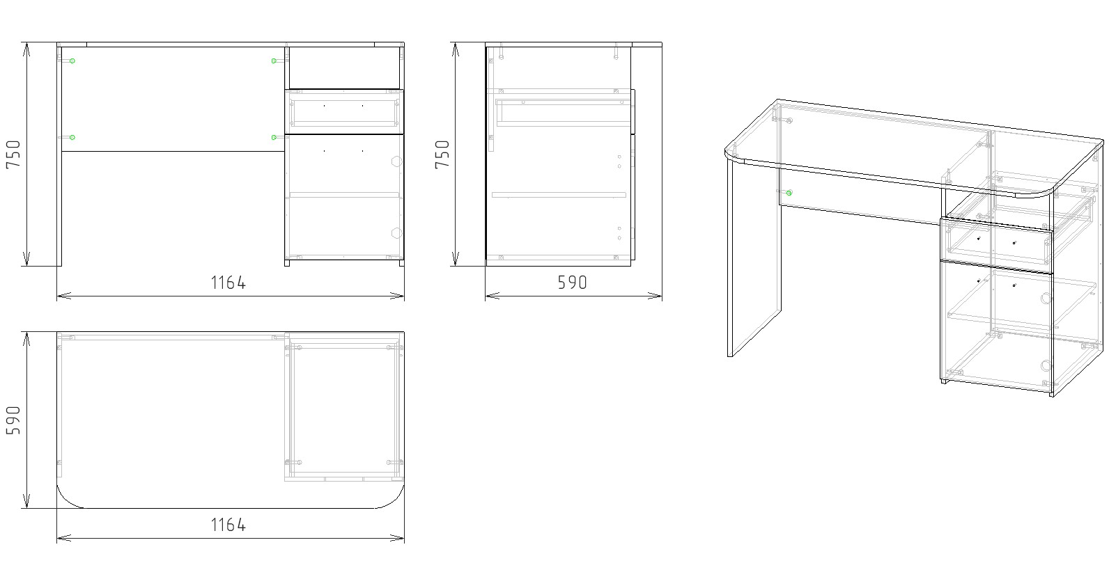 Габариты стола: ширина 1164 х высота 750 х глубина 590 мм