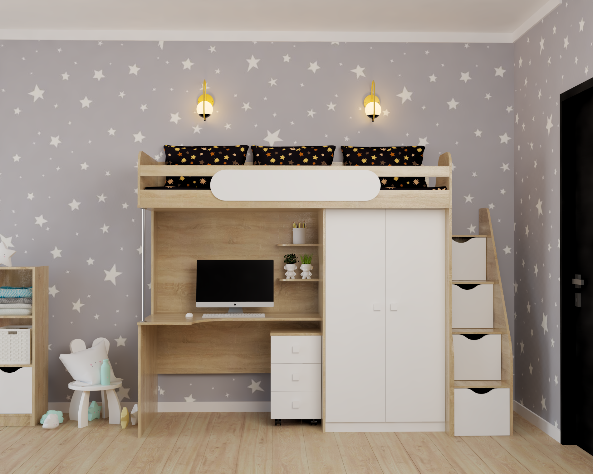 Основание кровати – прочный настил ЛДСП, который позволяет ребенку спать на ровной поверхности, что важно для детской спины. Прочное основание не скрипит и не сломается при играх. Отлично подходит как для пружинных, так и беспружинных матрасов.