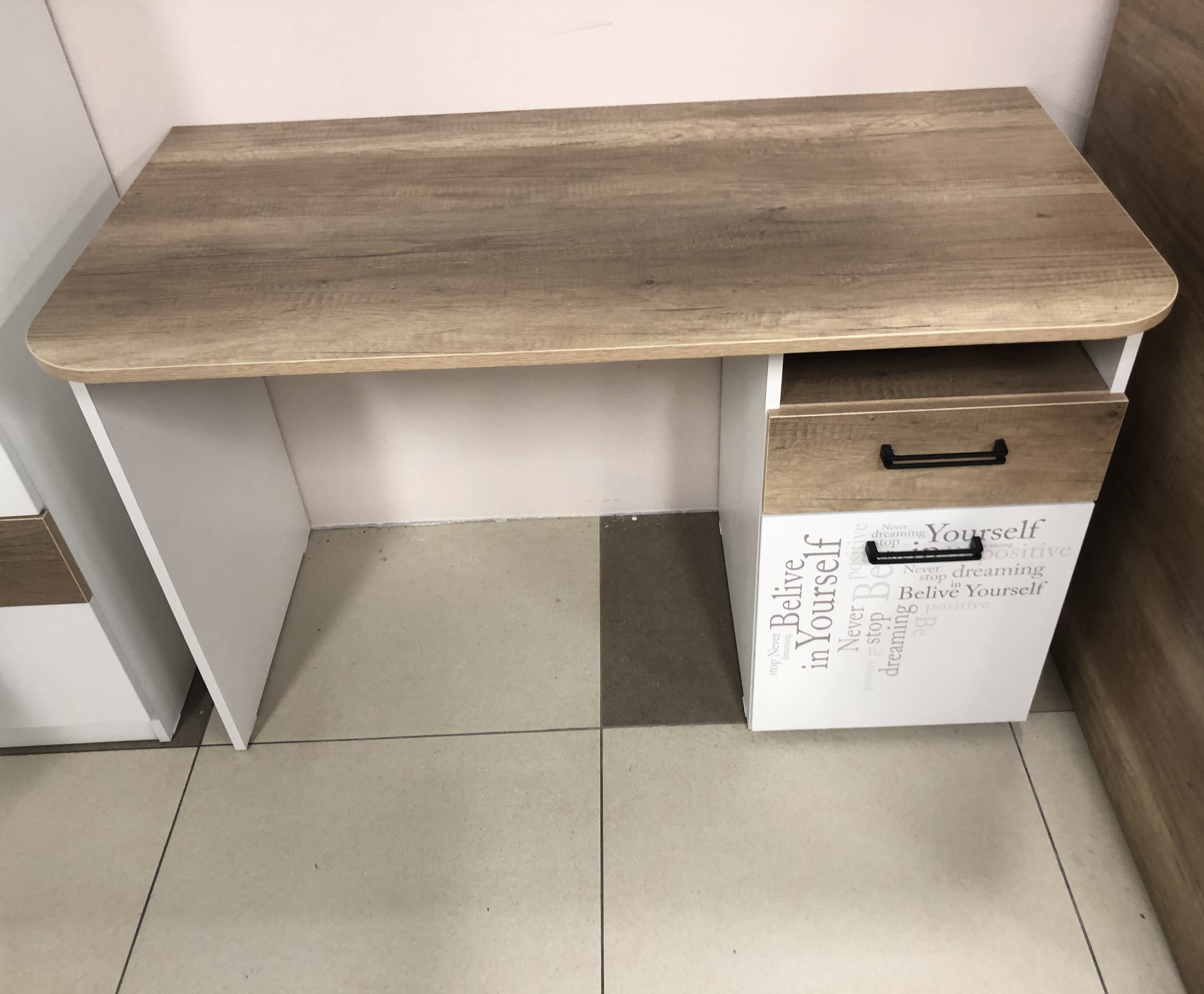ЛДСП класса Е0,5 в сочетании цветов "дуб каньон + белый" и оформлена дизайнерским принтом.