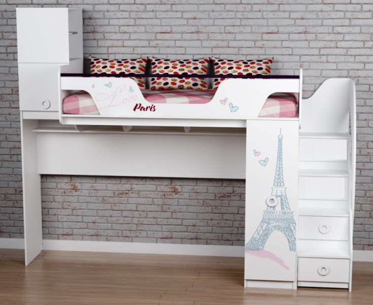 В кровать встроены шкаф для размещения одежды и удобная лестница с ящиками для игрушек.