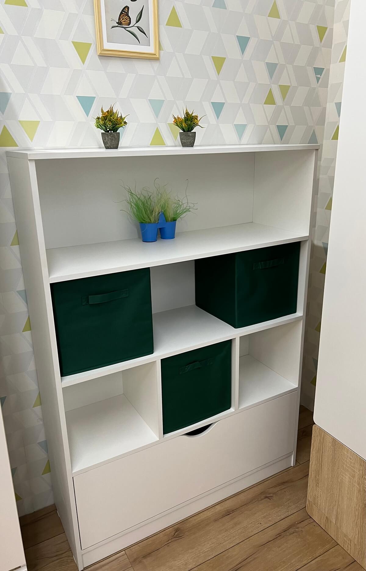 Вместительный стеллаж - практичное дополнение в интерьере детской комнаты.