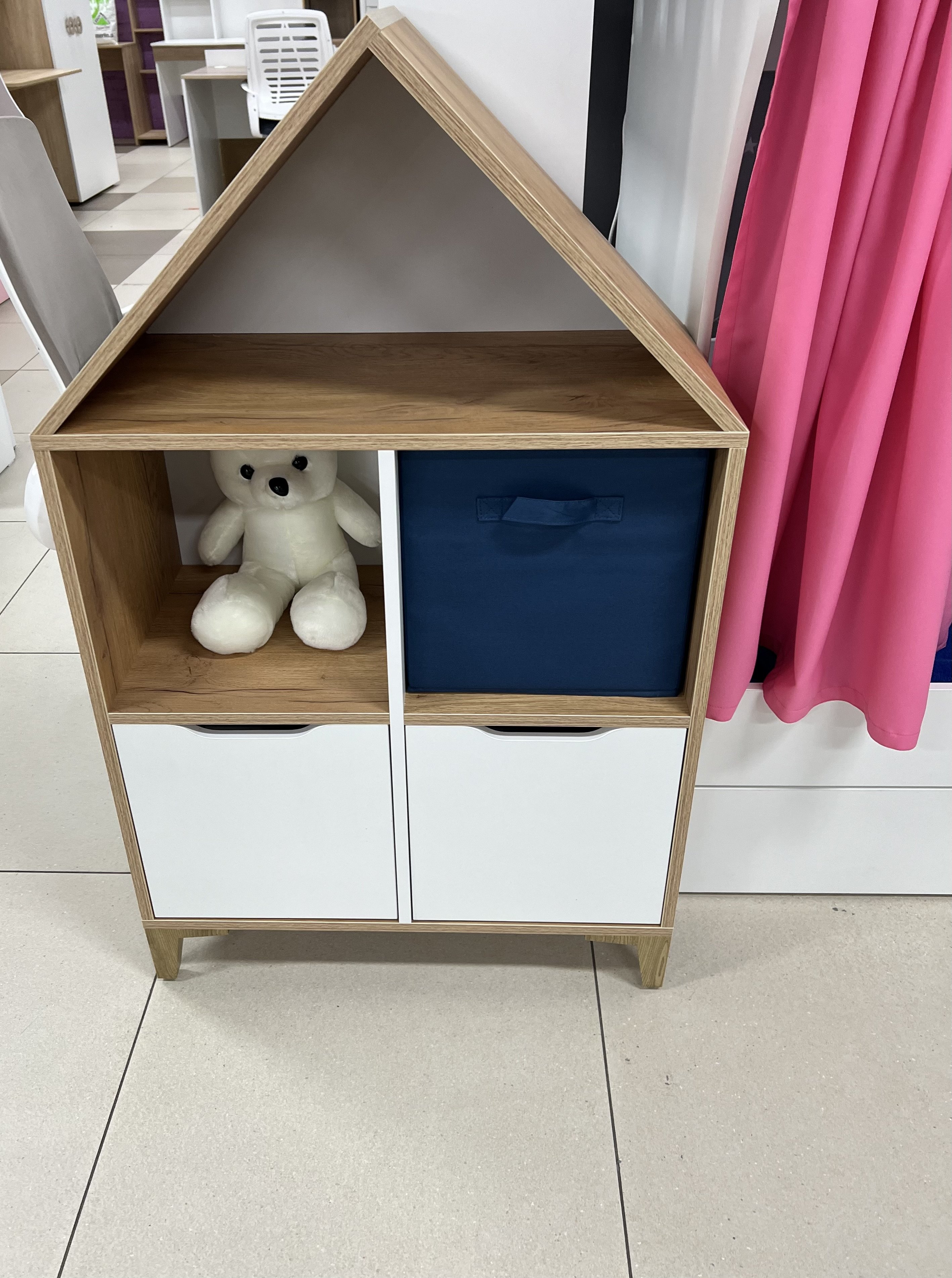 Стеллаж в виде домика - оригинальное и практичное дополнение в интерьере детской комнаты.
