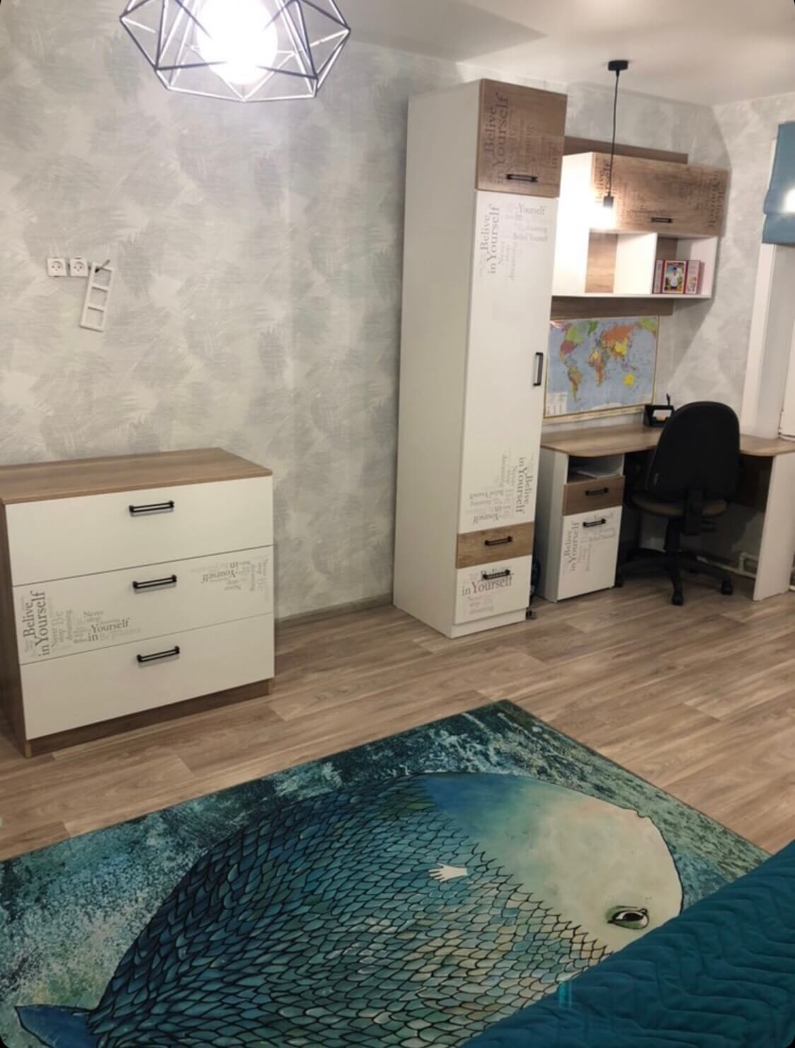 Мебель выполнена из сертифицированного, качественного, экологически чистого ЛДСП Е0,5 в сочетании цветов "дуб каньон + белый" и оформлена дизайнерским принтом.