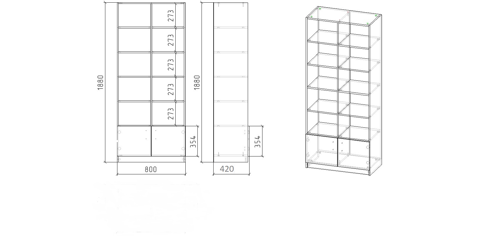 Габариты стеллажа: высота 1880 х ширина 800 х глубина 420 мм