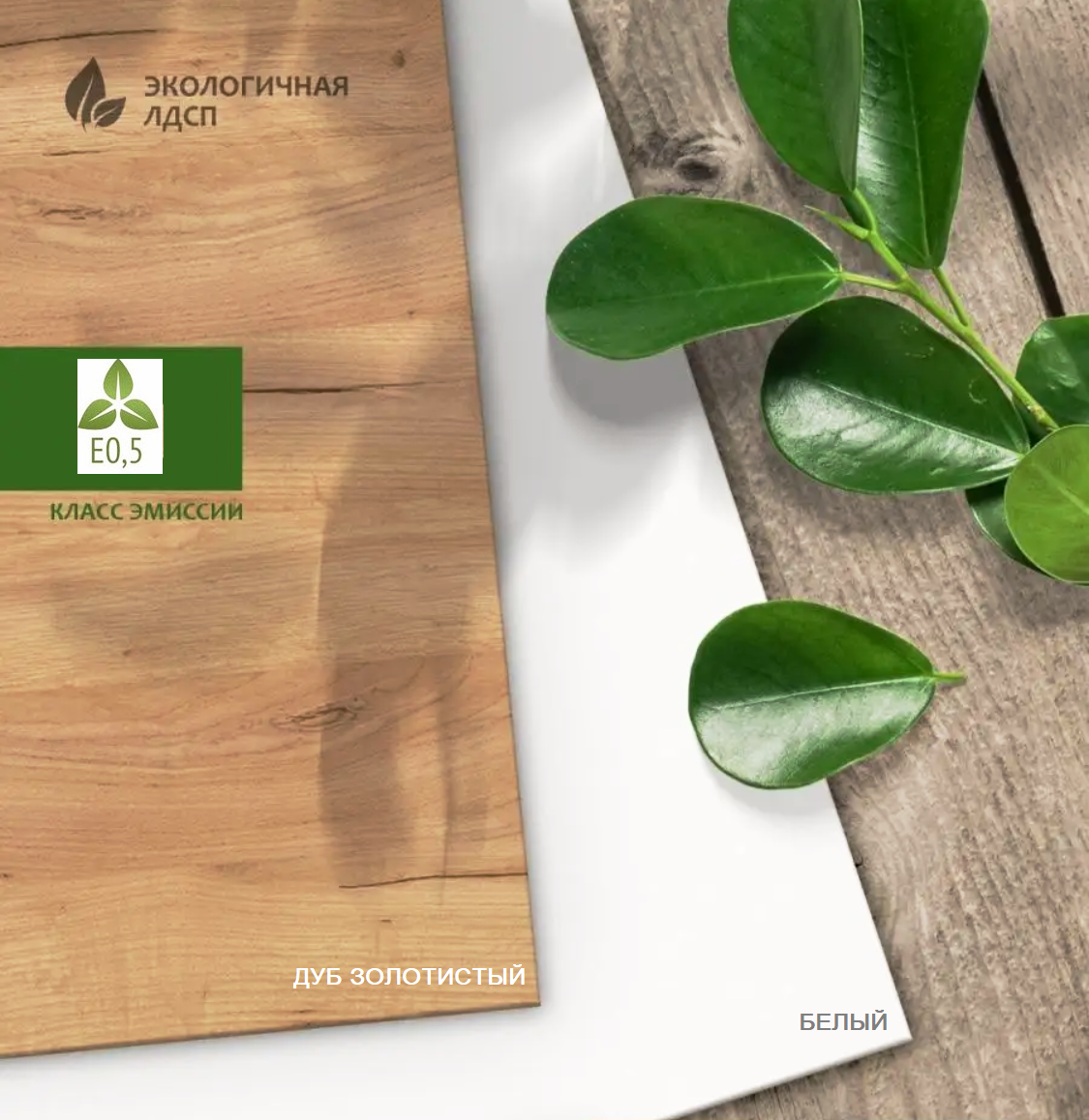 ЛДСП Е0,5. Толщина 16 мм. Доступна в цветах: корпус белый + фасады графит, корпус белый + фасады дуб золотистый, корпус дуб золотистый + фасады графит, полностью белый или полностью велюр