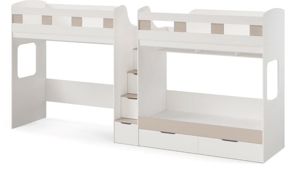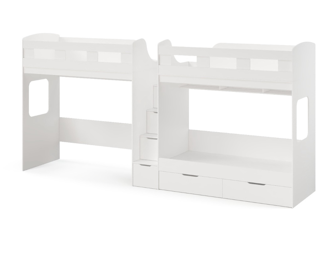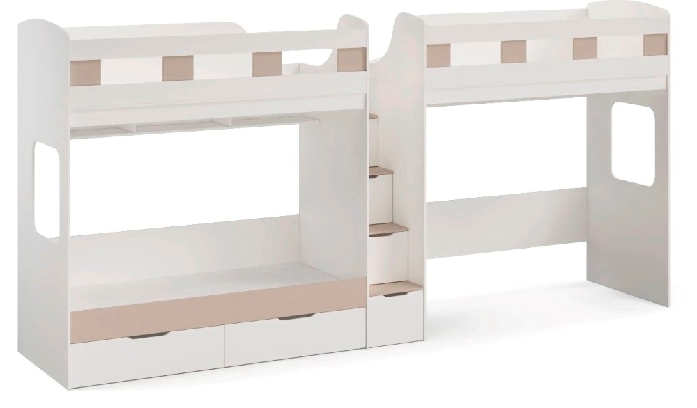 Высокая нагрузка на спальные места.. Удобная лестница-комод. Высокие, безопасные бортики. Прочные ящики!