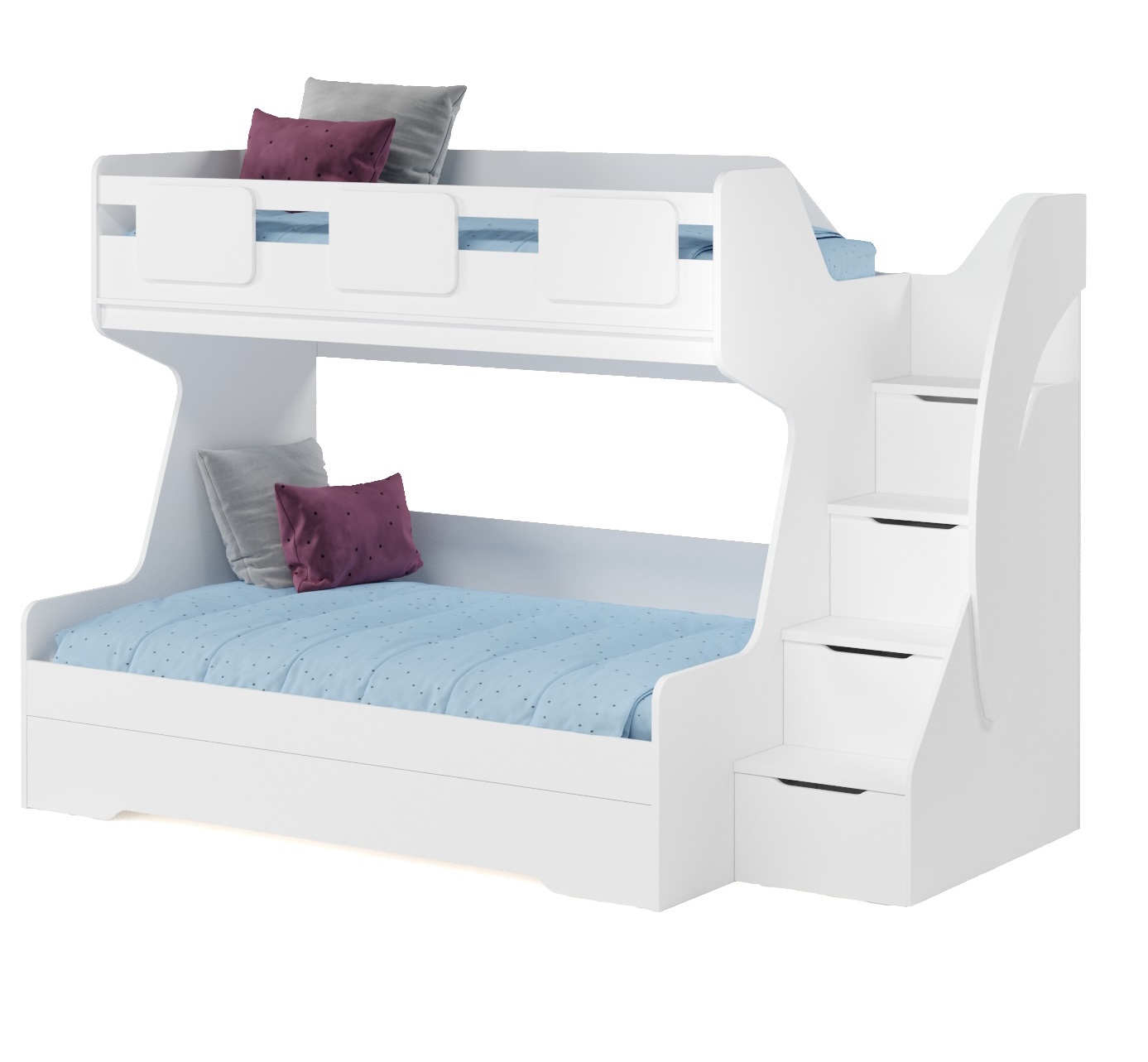В лестницу встроены выдвижные ящики для игрушек (два нижних ящика на направляющих скрытого монтажа с доводчиками, два верхних ящика на петлях с доводчиками)